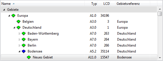 Das neue Gebiet wird immer eine Ebene unterhalb des ausgewählten Elements eingefügt. Wenn beispielsweise 'Deutschland' markiert ist, wird das neue Gebiet auf der Ebene von 'Baden-Württemberg' erstellt.