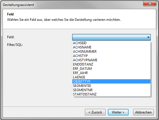 Über den Gestaltungsassisten lassen sich einfach Attribute kategorisieren und entsprechend darstellen. In einem ersten Schritt muss ein Feld (Attribut) ausgewählt werden, welches zur Kategorisierung verwendet werden soll. Über den Button weiter gelangt man zum nächsten Fenster.