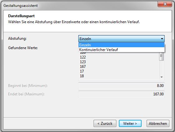 Im Drop-down Abstufung kann nun festgelegt werden, ob die Attributwerte einzeln oder als kontinuierlicher Verlauf dargestellt werden sollen. Im abgegildeten Beispiel handelt es sich um Objekttypen und somit um diskrete Werte (im Gegensatz zu stetigen Werten wie etwa Temperatur oder Niederschlagsmenge) und diese sollen als Einzelwerte dargestellt werden.