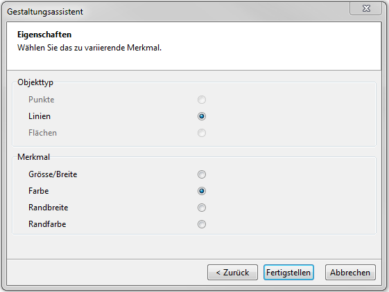 Im letzten Fenster können noch die Darstellungseigenschaften bestimmt werden. Im Beispieldatensatz sind nur Linien vorhanden, deshalb können hier unter Objekttyp nur Linien ausgewählt werden. Unter Merkmal lässt sich festlegen, über welches graphische Merkmal die Attributwerte variiert werden sollen. Im Beispiel dient die Farbe als Merkmal für den Objekttyp. Wählt man unter Abstufung Kontinuierlicher Verlauf, gelangt man im Fenster Zusatzthema bearbeiten in den Fensterbereich Verlauf, wo den Farbverlauf einstellen kann.