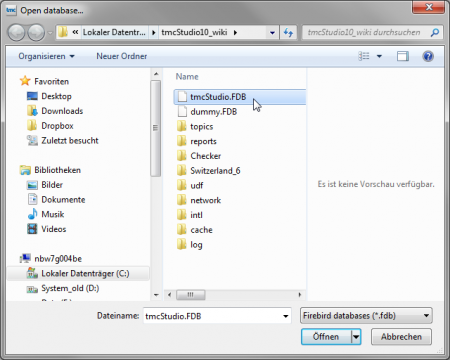 Choose this function to open an existing tmcStudio database from your computer. This database must be a Firebird database (*.fdb file) .
