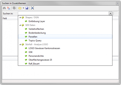 Die Funktion Suchen in Zusatzthemen dient dazu, in den als Hintergrundkarten angehängten Zusatzthemen nach bestimmten Werten oder Begriffen zu suchen, beispielsweise nach Parzellen mit einer gewissen Grösse. Die Funktion öffnet ein gleichnamiges Fenster, in welchem Suchbegriffe eingegeben und Ergebnisse angezeigt werden.