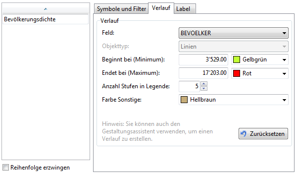 Für die Darstellung von kontinuierlichen Merkmalen können im Reiter Verlauf Farbverläufe definiert werden. Dabei können im Reiter Symbole und Filter ebenfalls verschiedene Filter gesetzt werden. Es kann jedem Filter ein eigenen Verlauf zugewiesen werden. Sind Angaben wie Minimum bzw. Maximum des Wertebereiches nicht bekannt, kann der Gestaltungsassistent verwendet werden, um Verläufe zu definieren.
