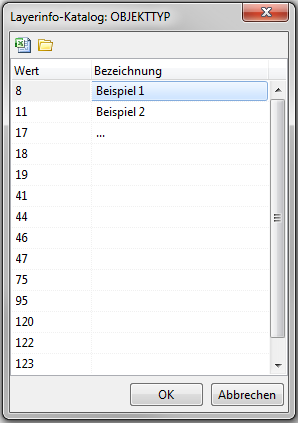 Klickt man auf den Button Katalog oben rechts im Fenster, öffnet sich das folgende Fenster. Darin lassen sich den einzelnen Werten eines Attributs andere Werte oder Namen zuweisen. Die neuen Bezeichnungen lassen sich als .xls speichern und können bei Bedarf wieder geladen werden.
