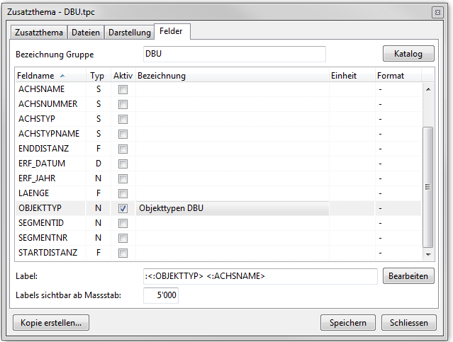 Bezeichnung Gruppe Hier kann eine Gruppenbezeichnung eingegeben werden, unter welcher die entsprechenden Attribute im Fenster Information Zusatzthemen zusammengefasst werden. Wird keine alternative Bezeichnung (siehe unten) eingegeben, wird diese auch im Fenster Information Zusatzthemen angezeigt.