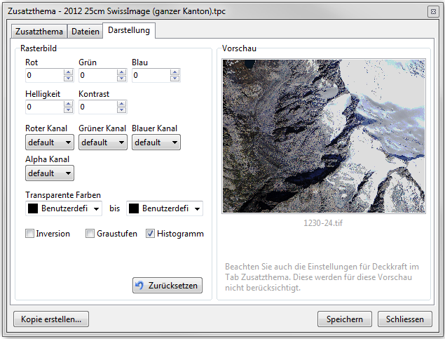 Im Reiter Darstellung können Darstellungseinstellungen vorgenommen werden. Die Möglichkeiten unterscheiden sich, je nach dem ob man Raster- oder Vektordaten darstellen will.