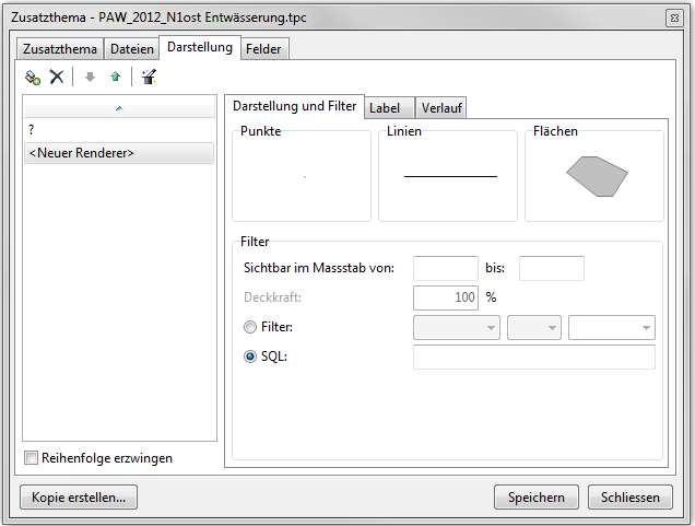 Im Fensterbereich Symbole und Filter kann bestimmten Wertebereichen eines Attributes eine bestimmte Darstellung zugeordnet werden. Dazu wählt man eine Punkt-, Linien- oder Flächensymbologie und weist ihr über den Filter einen bestimmten Wertebereich zu. Es besteht auch die Möglichkeit, den Filter direkt im Fester SQL zu schreiben. Über die Funktionen Renderer löschen und Renderer nach unten bzw. oben verschieben, lässt sich die Liste organisieren.