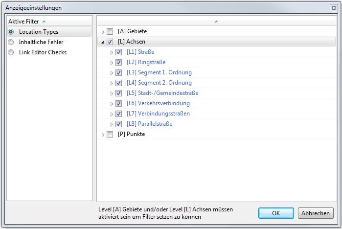 Über die Funktion Anzeigeeinstellungen bearbeiten... lassen sich die Daten auswählen, die in der Karte und im Datenbaum angezeigt werden sollen.