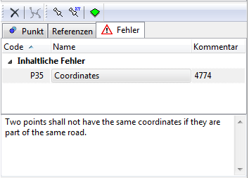 Mit diesen Anzeigeeinstellungen werden nur Objekte in der Objektliste und der Karte angezeigt, die inhaltliche Fehler enthalten. Die Informationen zum aktuell gewählten Objekt werden im Detailfenster unterhalb der Objektliste angezeigt. Unter dem Reiter Fehler erscheint die aktuelle Fehlermeldung mit Kommentar, mit Klick auf den Eintrag die detaillierte Erklärung des Fehlers.