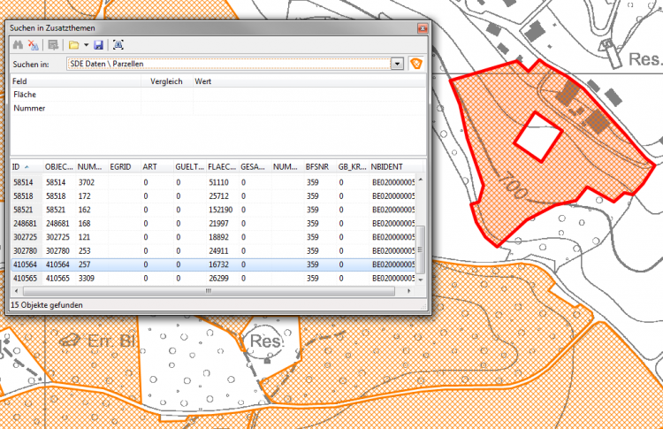 Die Funktion Suchen in Zusatzthemen dient dazu, in den als Hintergrundkarten angehängten Zusatzthemen nach bestimmten Werten oder Begriffen zu suchen, beispielsweise nach Parzellen mit einer gewissen Grösse. Die Funktion öffnet ein gleichnamiges Fenster, in welchem Suchbegriffe eingegeben und Ergebnisse angezeigt werden.