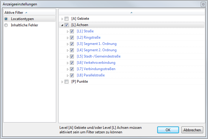 Über die Funktion Anzeigeeinstellungen bearbeiten... lassen sich die Daten auswählen, die in der Karte und in der Objektliste angezeigt werden sollen.