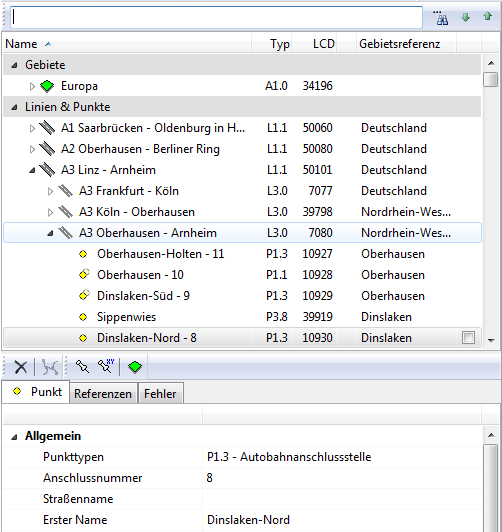 In den Spalten werden der Typ, der Location Code und die Gebietsreferenz der Objekte angezeigt, zudem kann das Objekt selektiert oder deselektiert werden.