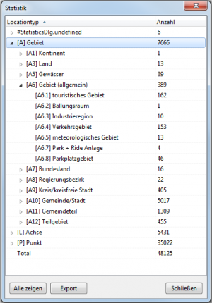 Die Funktion Statistik... erstellt eine Liste, die sämtliche Gebiete, Achsen und Punkte sowie die jeweiligen Unterkategorien auflistet und das Total aller im Objektbaum enthaltenen Objekte anzeigt.