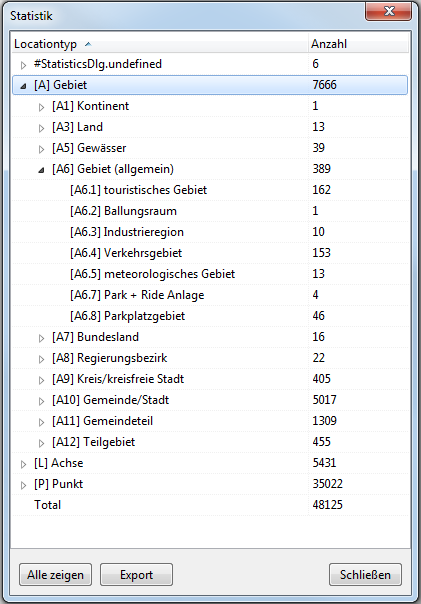 Die Funktion Statistik... erstellt eine Liste, welche die Anzahl sämtlicher Gebiete, Achsen und Punkte aufführt sowie das Total aller im Objektbaum enthaltenen Objekte anzeigt.